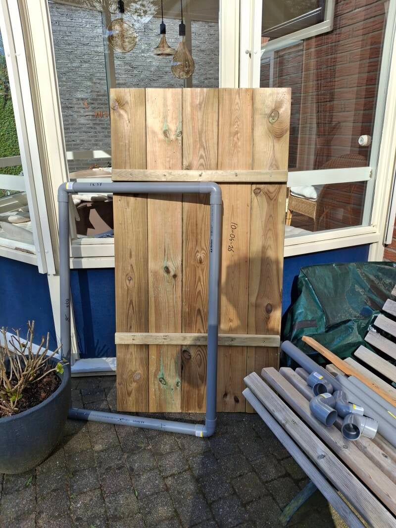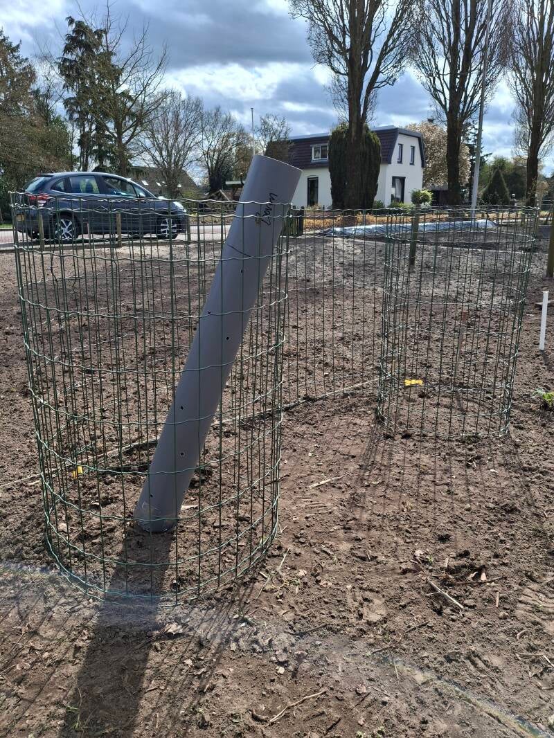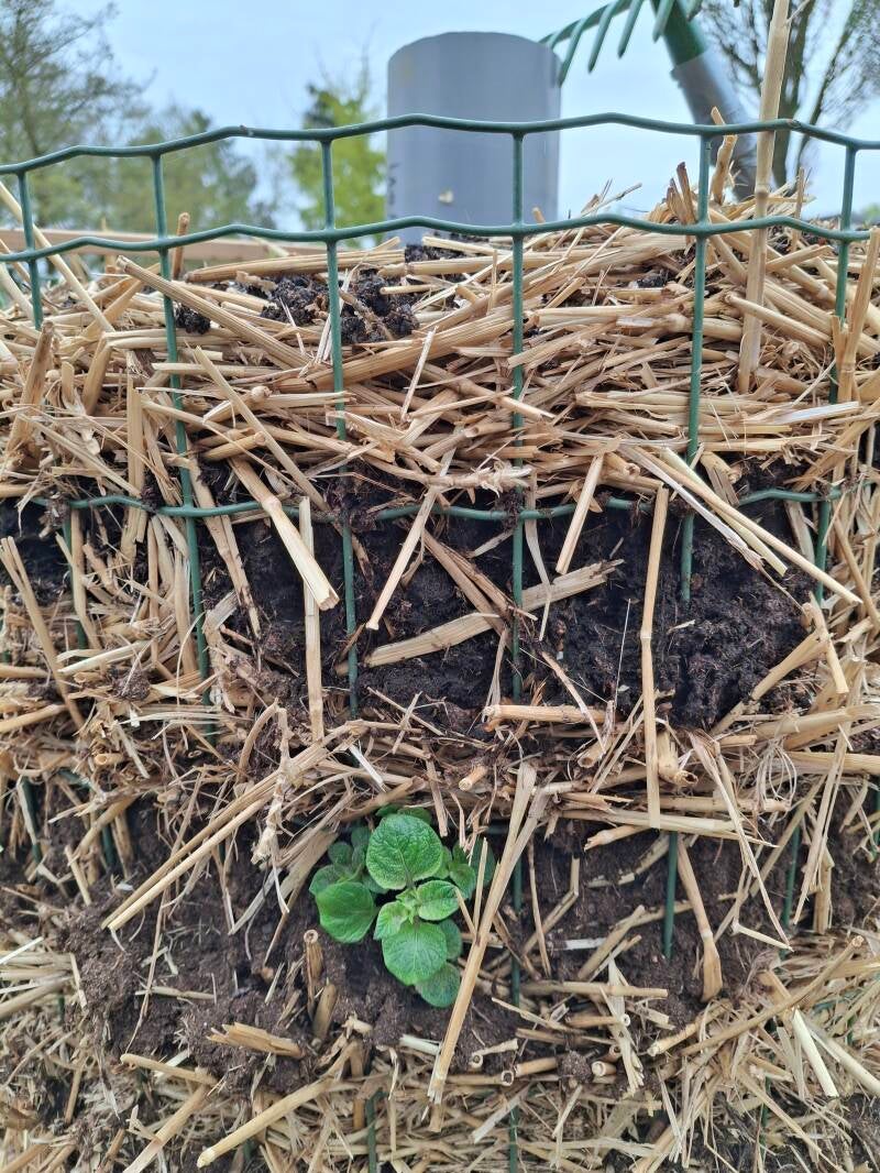 4 April: Begonnen met een experiment; verticaal verbouw aardappels π₯πIn het midden een buis met gaatjes en grind, daarna begonnen met een laag stro (ik doe nooit weer een pak stro in de kofferbak....) vervolgens een laagje tuinaarde met aardappels- daarna weer stro en weer tuinaarde met aardappels enz.