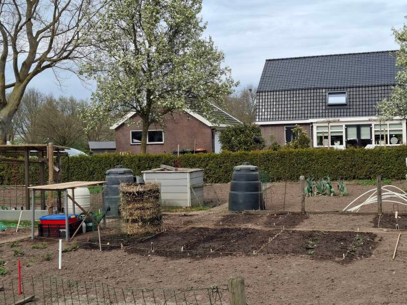 22 maart: De zaadjes groeien gestaag verder en zondagmorgen de 4,4 bij 10 meter moestuin even bekeken.