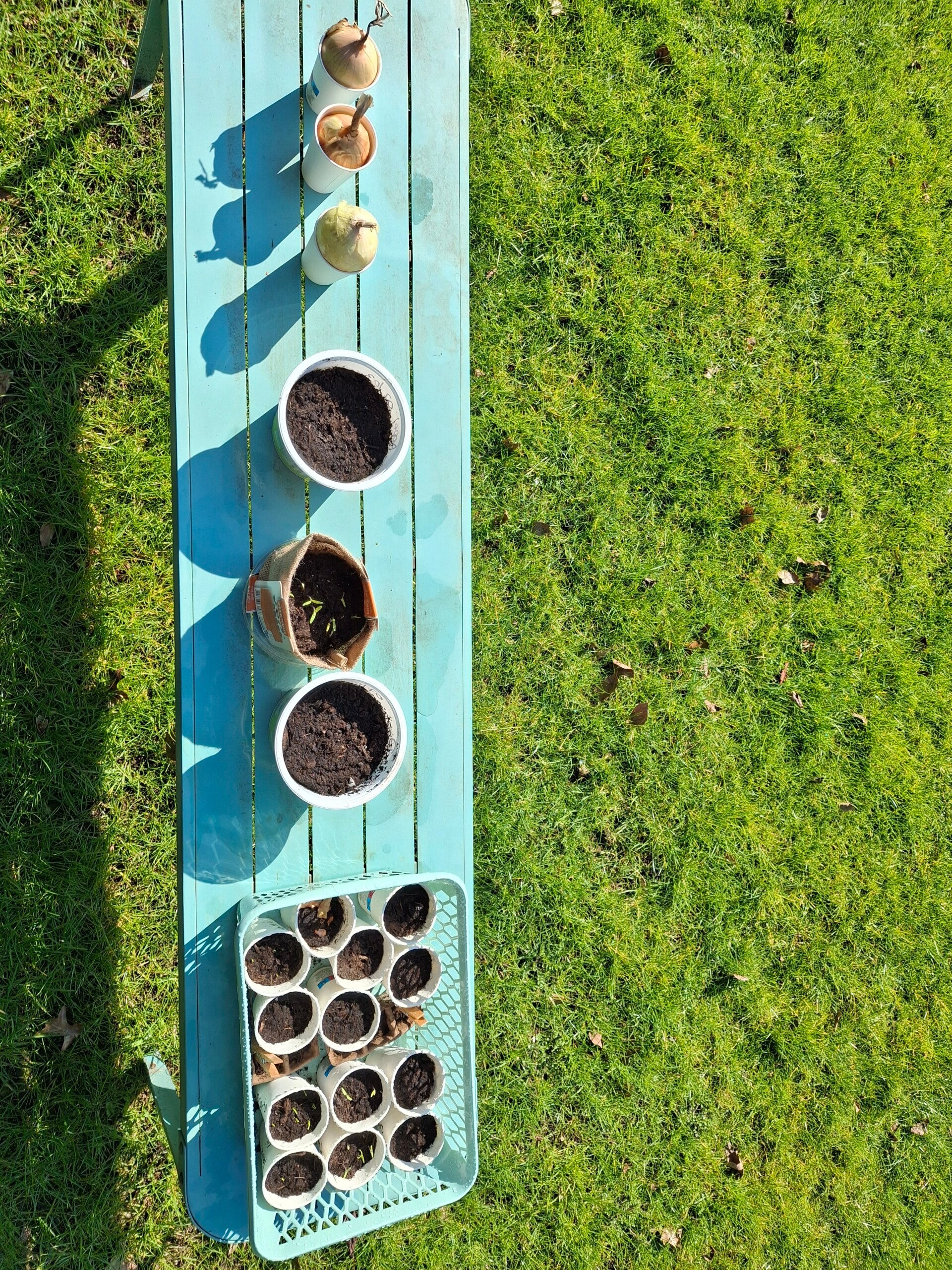 1 April: De uien hebben inmiddels behoorlijk wat wortels en deze nu in een pot met aarde gezet.