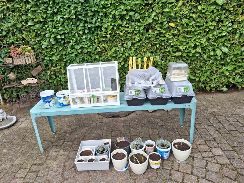 Probeer ook om Lavendel te stekken. Een aantal takjes in tuinaarde en in water gezet. Ook maar weer afwachten of dit een succes wordt. De knoflook ziet er niet florissant uit maar komt straks misschien wel weer bij wanneer er meer zon en dus warmte komt, anders maar nieuwe poten in de volle grond (in de kast liggen diverse teentjes met uitlopers).